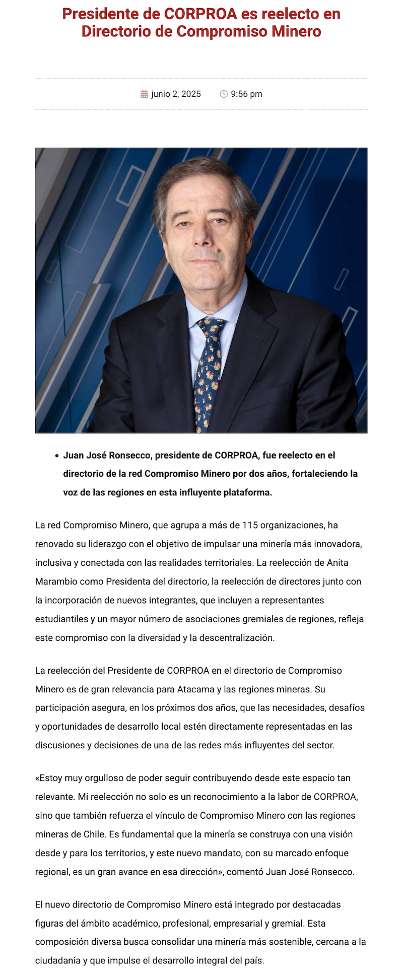 Juan José Ronsecco de Corproa Atacama seguirá en directorio de Compromiso Minero - (chilepaisminero.com)