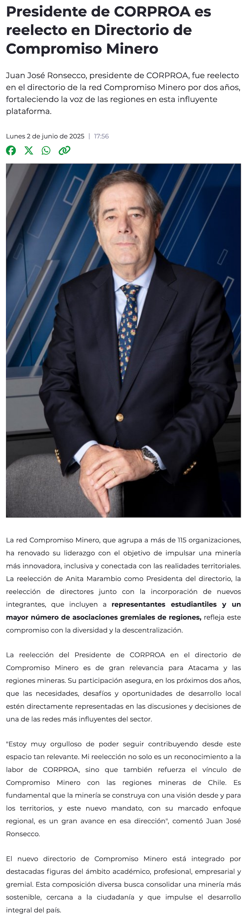 Juan José Ronsecco de Corproa Atacama seguirá en directorio de Compromiso Minero - (chilepaisminero.com)