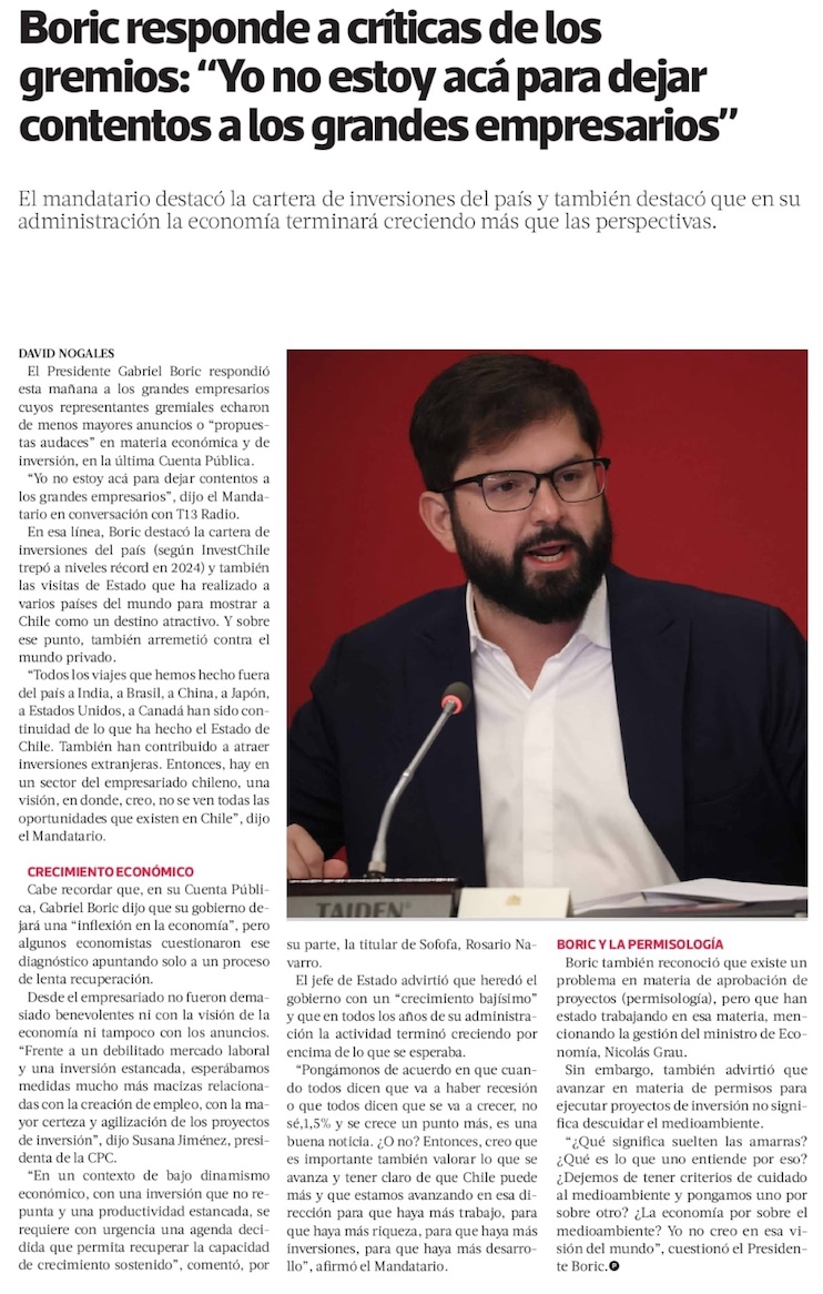 Boric responde críticas por crecimiento: “No estoy acá para dejar contentos a los grandes empresarios” - (Diario Financiero)