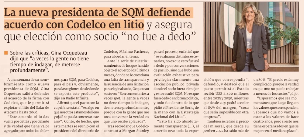 Nueva presidenta de SQM defiende acuerdo con Codelco, pero advierte que el precio del litio “está muy complicado” - (Pulso)