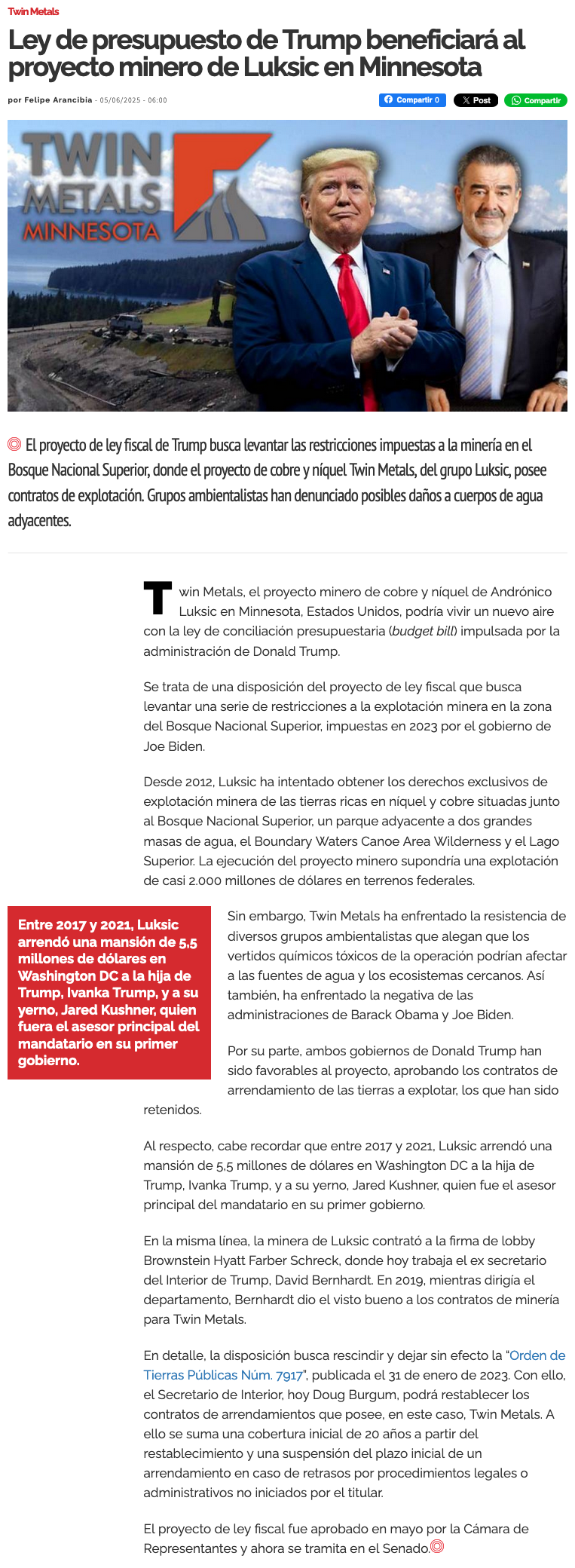 Proyecto fiscal de la Casa Blanca incluye revocación de veto que afecta a proyecto minero de los Luksic en Minnesota - (Diario Financiero)