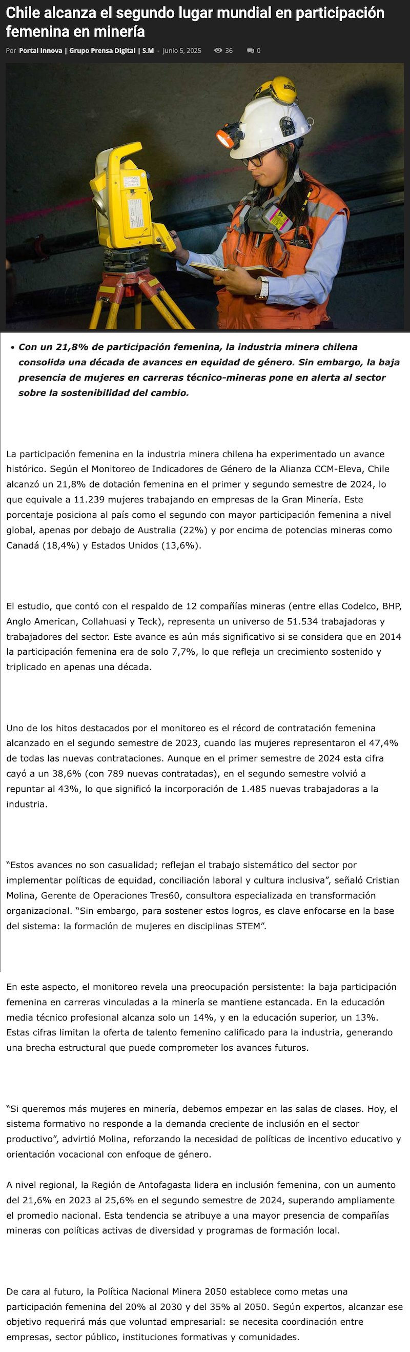 Chile alcanza el segundo lugar mundial en participación femenina en minería - (regionesnoticias.cl)