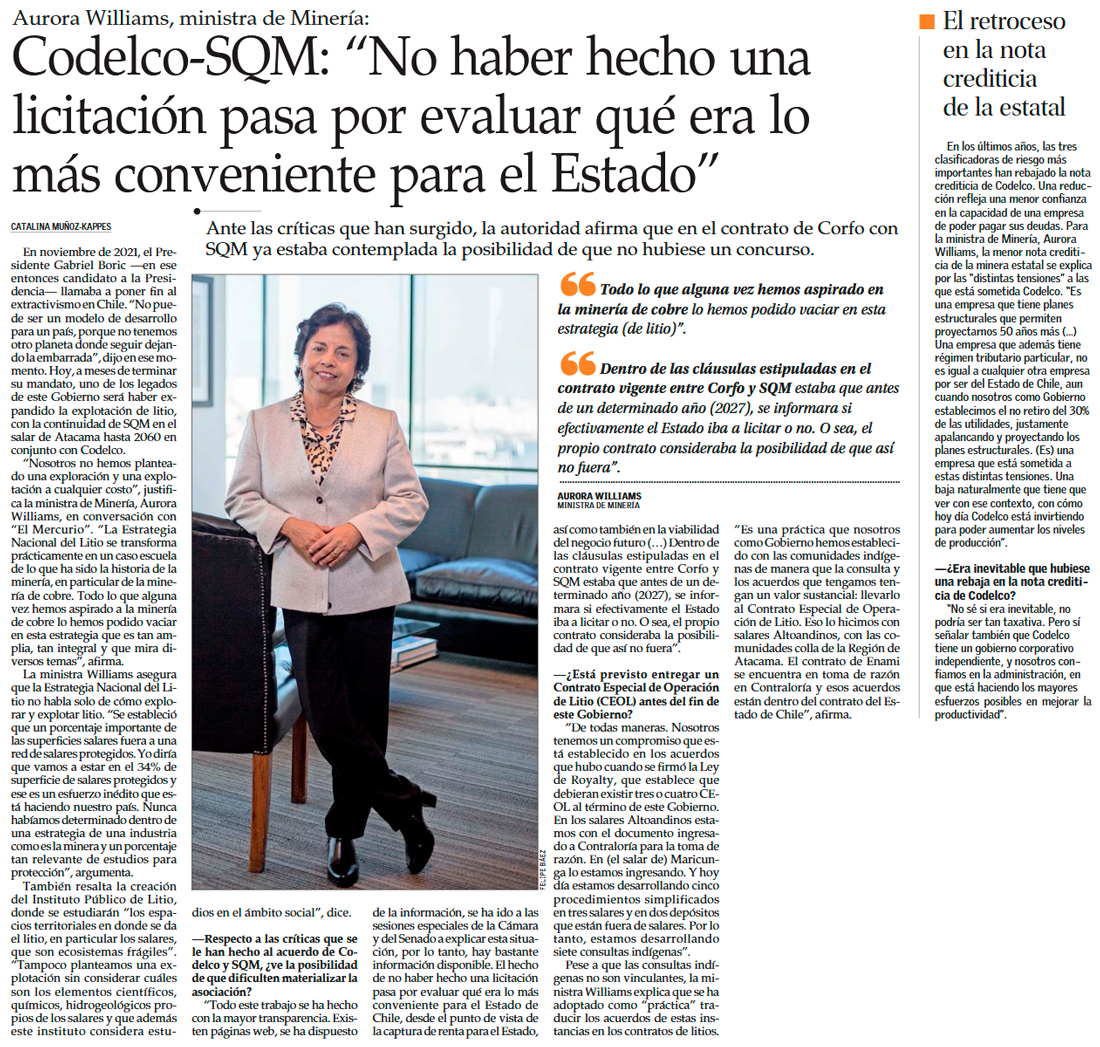 Aurora Williams: "Si no hubiera interés, nuestras empresas no se estarían asociando con los actores globales en materia minera" - (El Mercurio de Antofagasta)