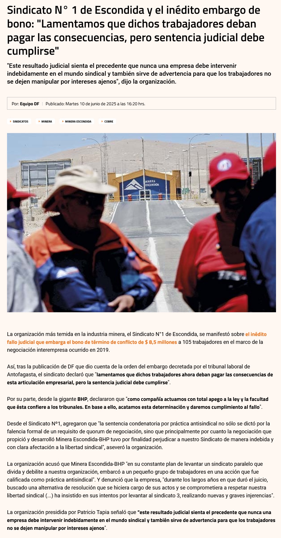 BHP "es la única responsable de devolución del bono": Sindicato N°1 de Escondida lanza dardo a empresa - (biobiochile online)