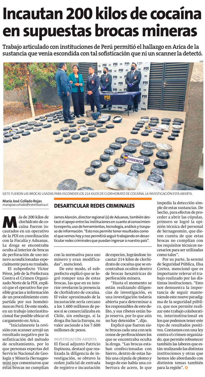 Nueva modalidad para ocultar droga: hallan 214 kilos de cocaína en brocas perforadoras que se usan en la minería - (El Mercurio de Santiago)