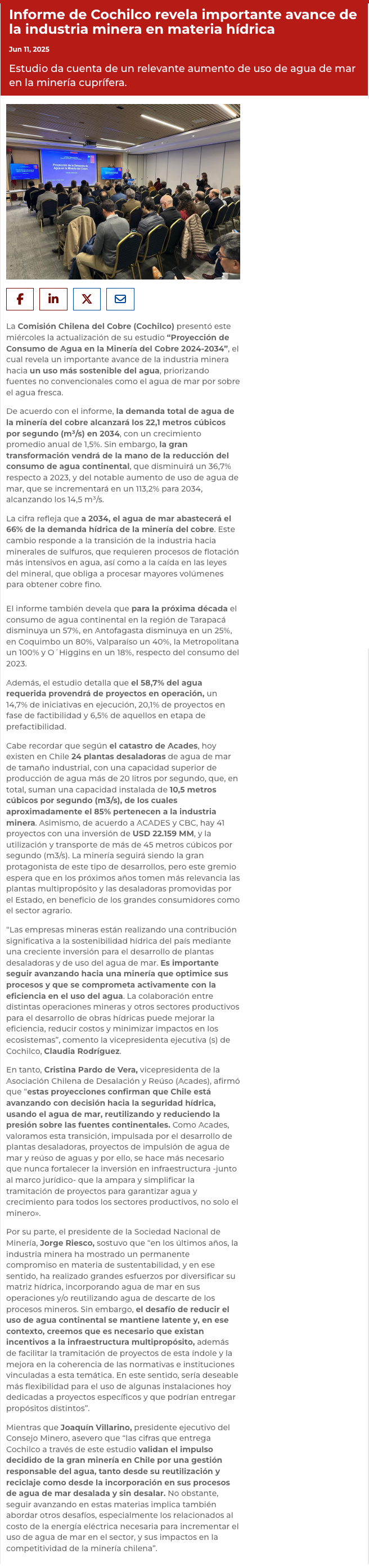 Minería chilena proyecta que 70% de su consumo de agua provendrá del mar para 2034 - (electromineria.cl)
