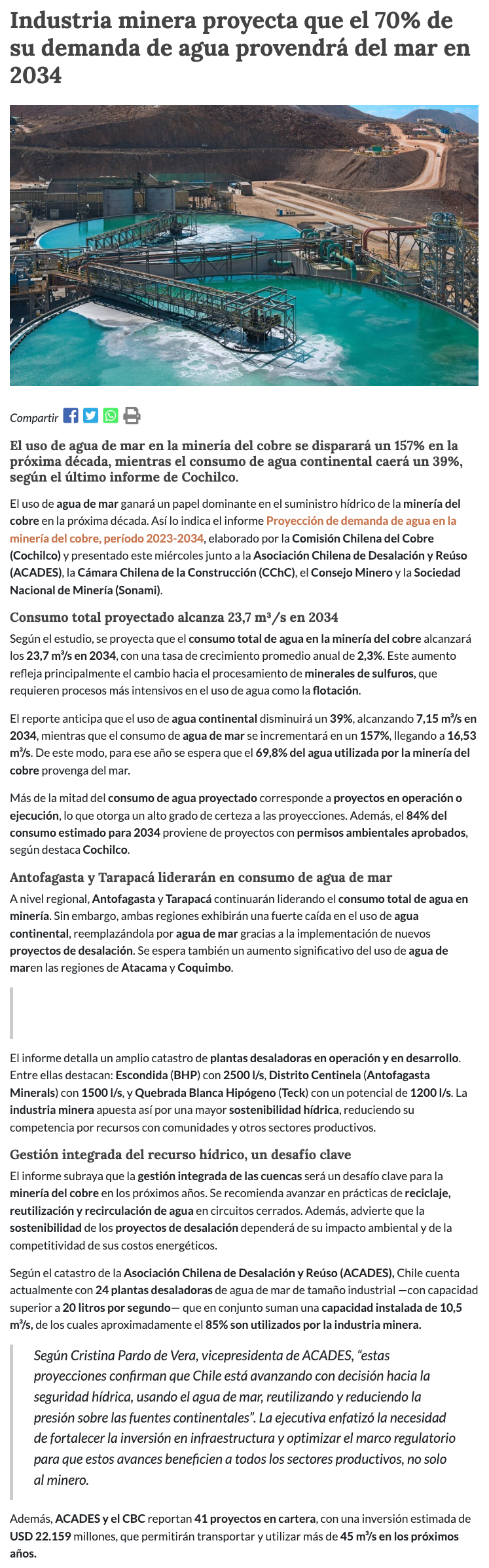 La minería del cobre duplicará el uso de agua de mar para 2034 y reducirá el consumo de agua fresca en casi 37% - (nuevaminería online)