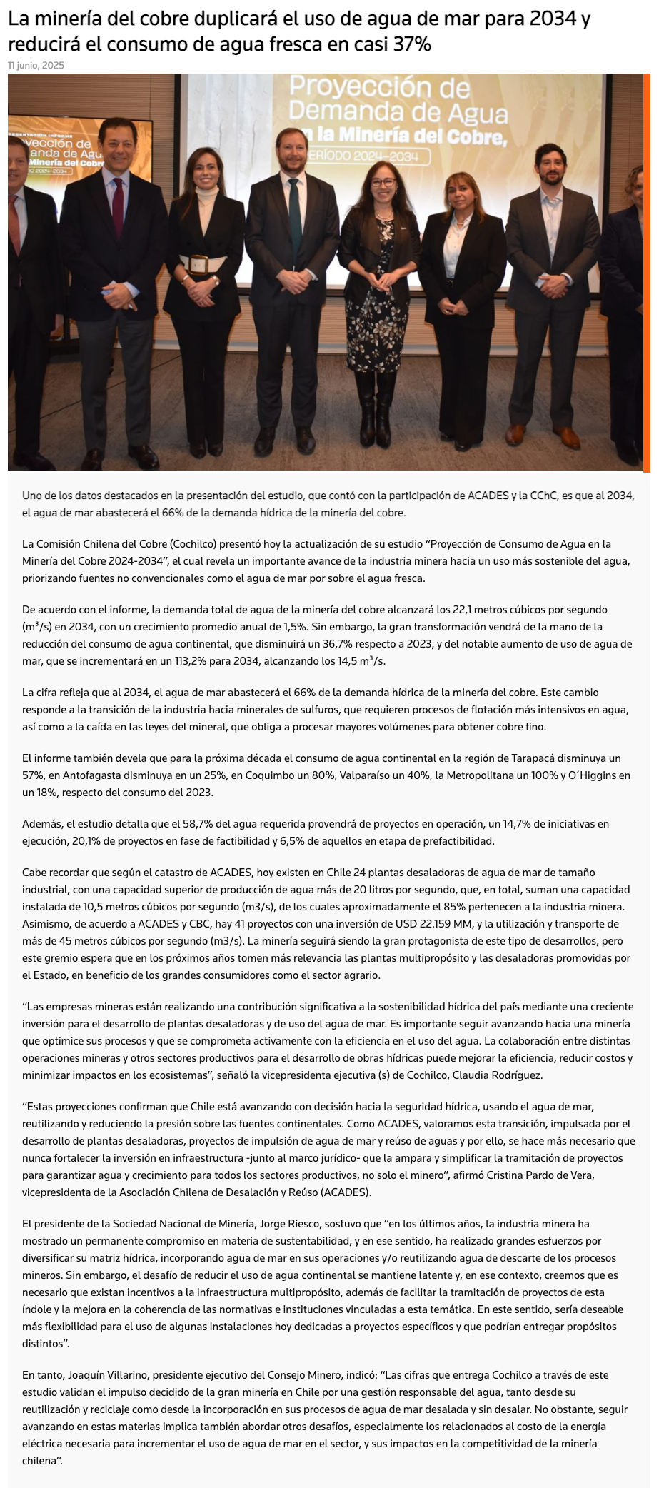 Minería chilena proyecta que 70% de su consumo de agua provendrá del mar para 2034 - (electromineria.cl)