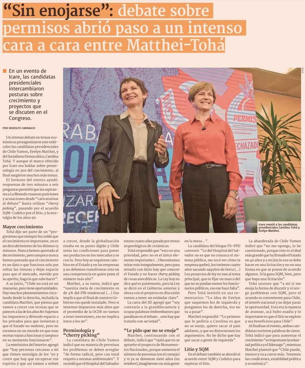 Con enfrentamientos por permisología y acuerdo Codelco-SQM: el primer duelo entre Tohá y Matthei en Icare - (La Tercera)