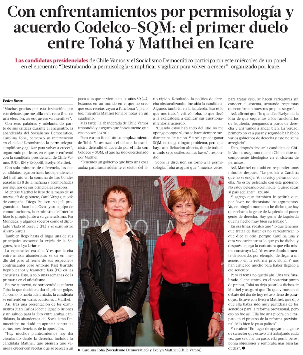 Matthei y Tohá se enfrentan por impuestos, “permisología” y acuerdo Codelco-SQM - (El Mercurio de Santiago)