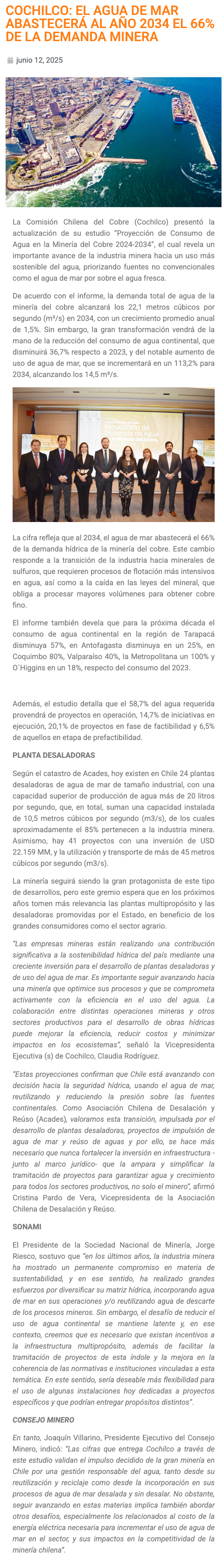 La minería del cobre duplicará el uso de agua de mar para 2034 y reducirá el consumo de agua fresca en casi 37% - (portalminero)
