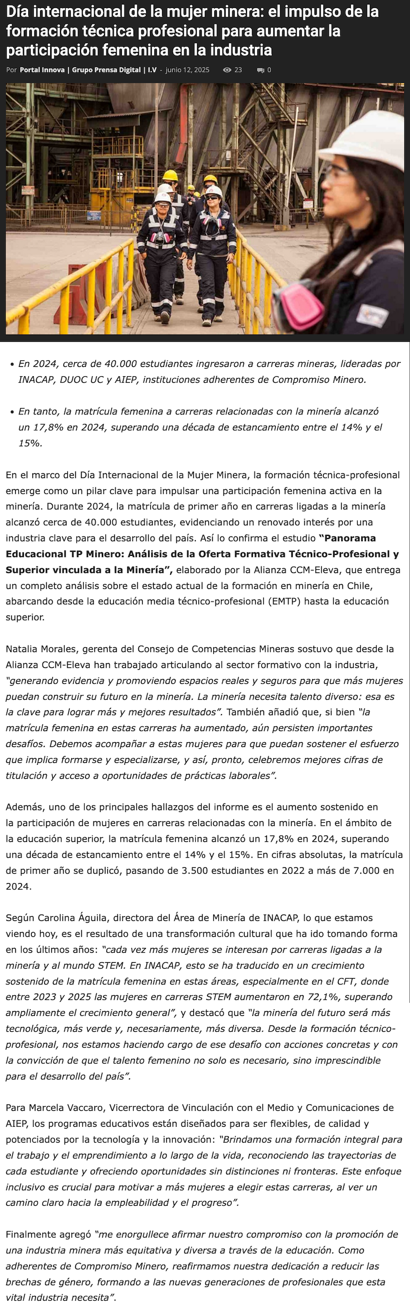 Día internacional de la mujer minera: el impulso de la formación técnica profesional para aumentar la participación femenina en la industria - (regionesnoticias.cl)