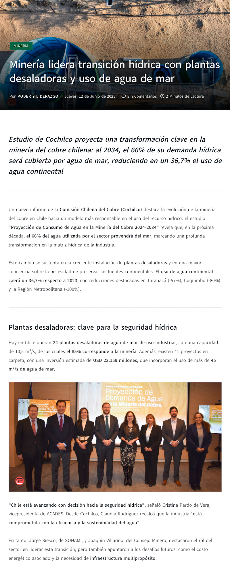 Cochilco: el agua de mar abastecerá al año 2034 el 66% de la demanda minera - (revistacrisol.cl)