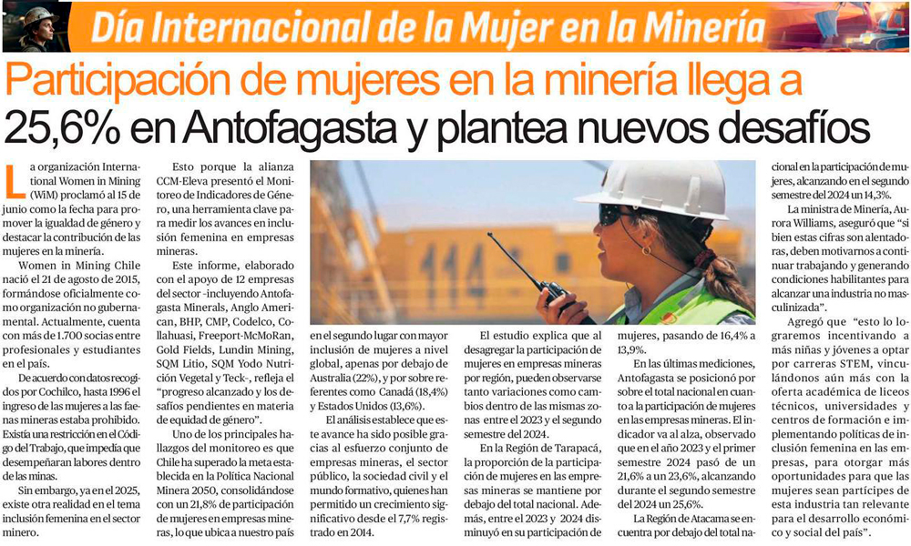 Participación de mujeres en minería llega a 25,6% en Antofagasta y plantea nuevos desafíos - (El Mercurio de Antofagasta)