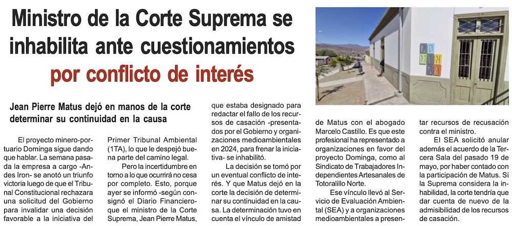 Dominga: ministro de la Corte Suprema se inhabilita y sentencia clave para proyecto se retrasa - (Diario Financiero)