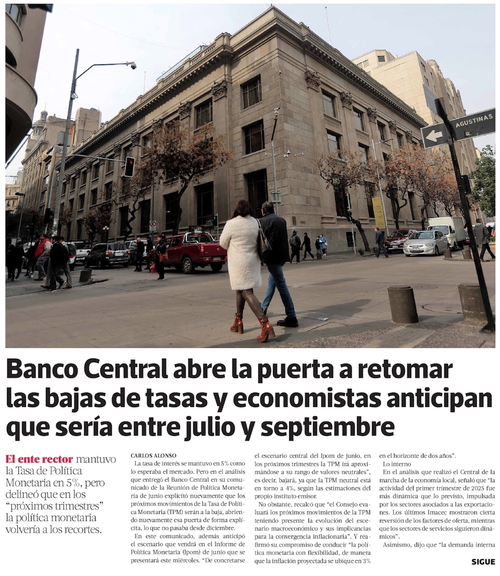 BC anticipa futuros recortes de la tasa de interés y alerta por lenta creación de empleo - (El Mercurio de Santiago)