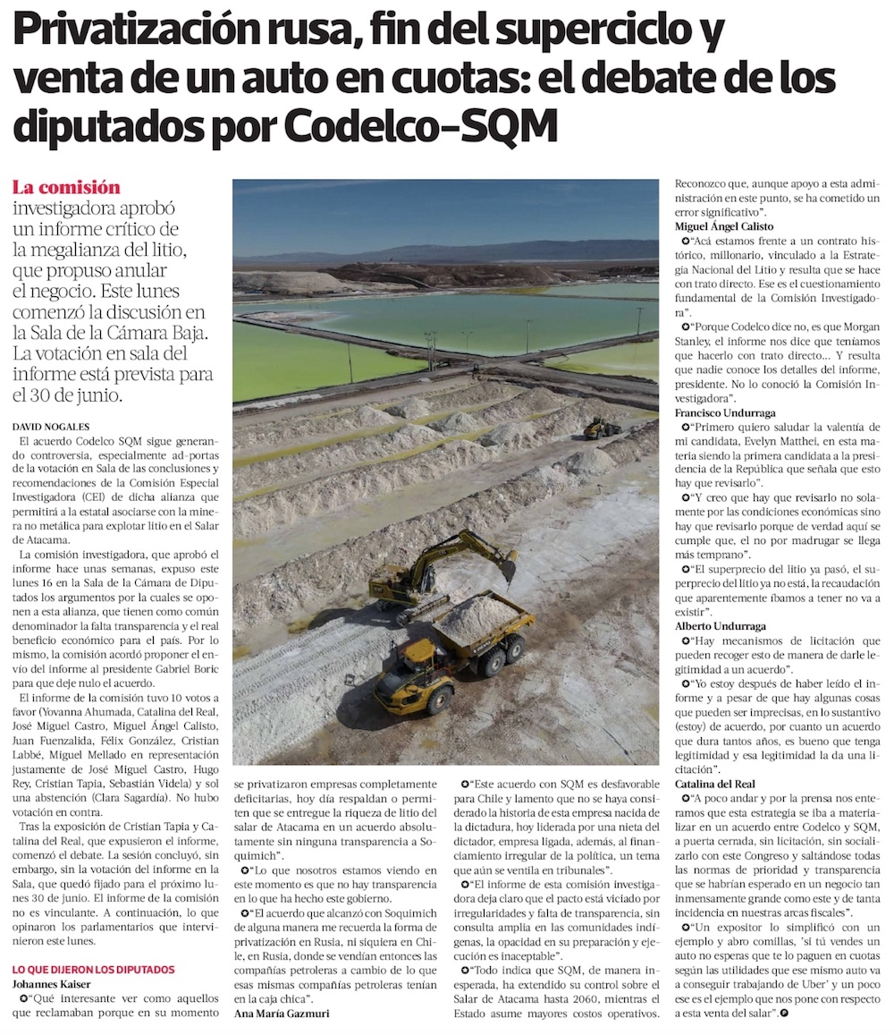 Duras críticas contra el acuerdo Codelco-SQM en la Cámara de Diputados - (La Segunda)