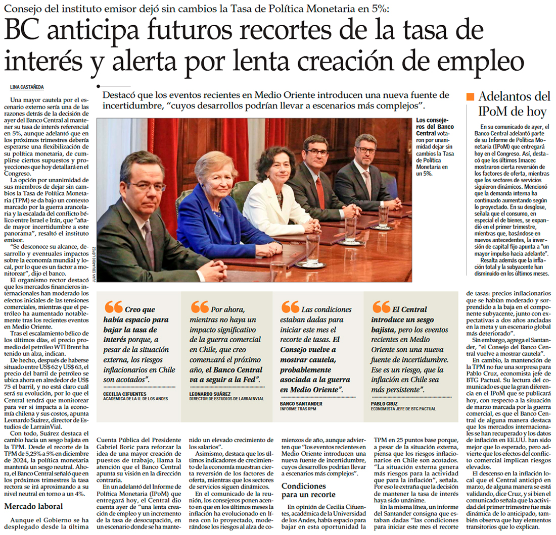 Banco Central toma nota de la “mayor incertidumbre” por conflicto en Medio Oriente y deja la tasa sin cambios - (Diario Financiero)