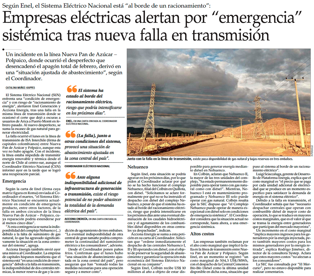 Línea del apagón sufre nueva falla y Enel alerta que sistema está en “condición de emergencia” - (Diario Financiero)