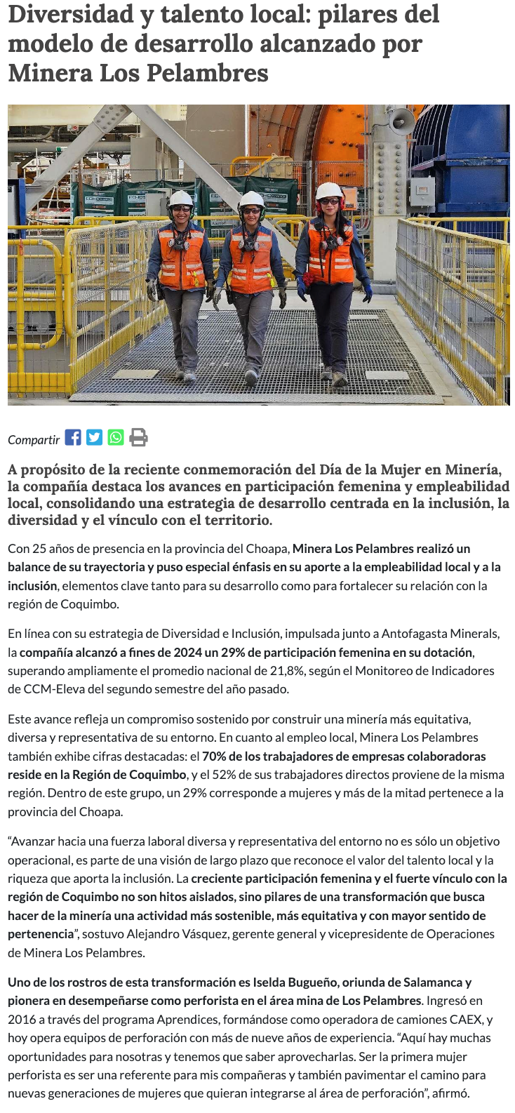 Minera Los Pelambres alcanza el 29% de participación femenina y lidera la inclusión en la industria minera de Chile - (redimin)