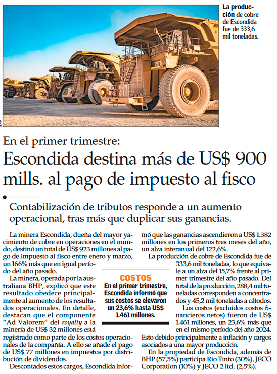 Escondida más que duplica sus ganancias en el primer trimestre y pagos al Fisco superan los US$ 900 millones en impuestos - (Pulso)
