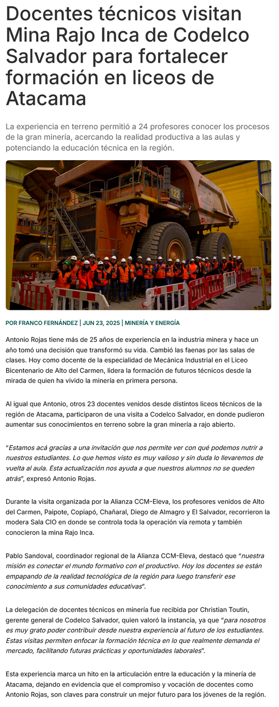 Docentes de Atacama visitan Rajo Inca para capacitarse en avances de los procesos mineros - (atacamanoticias)