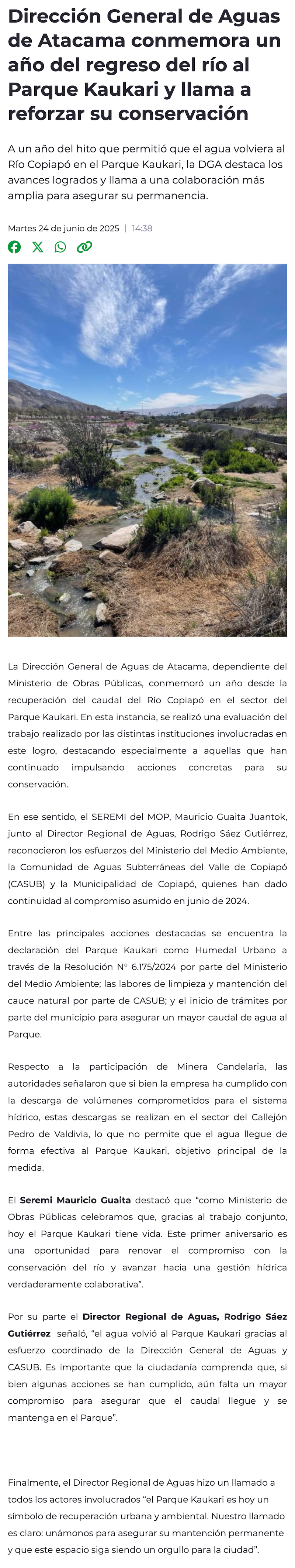 Dirección General de Aguas de Atacama conmemora un año del regreso del río al Parque Kaukari - (atacamaenlinea.cl)