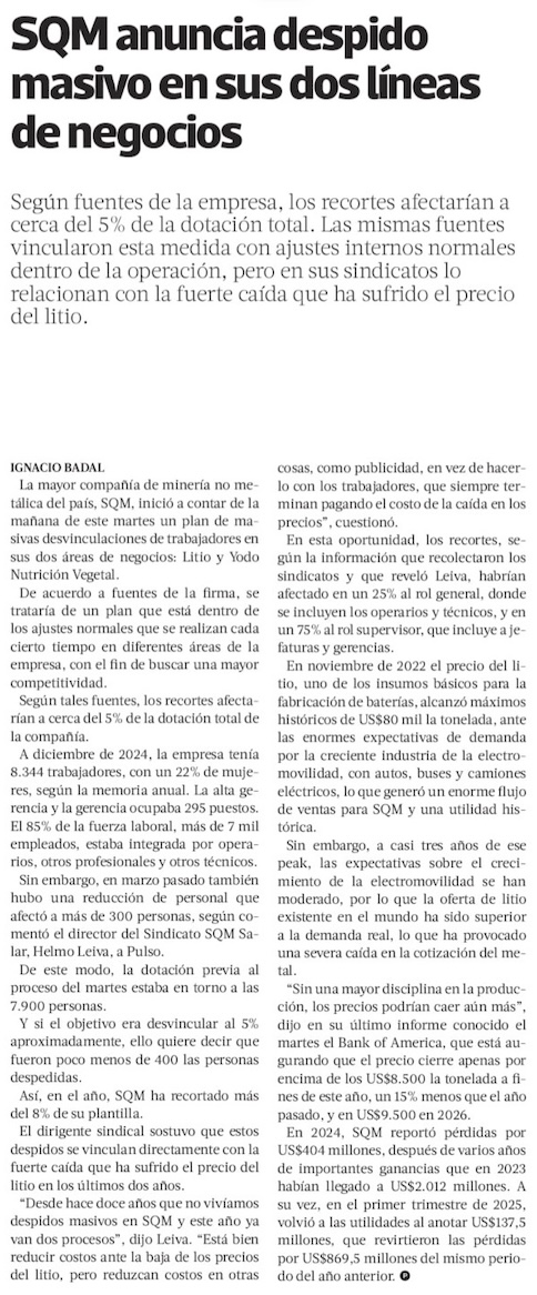 Tras baja sostenida del litio, SQM desvincula al 5% del personal - (El Mercurio de Santiago)