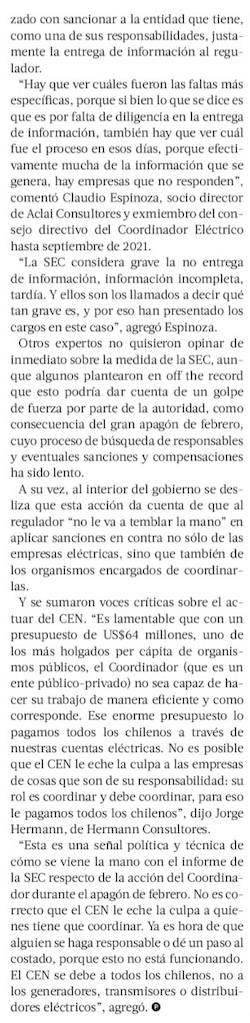 Por primera vez, SEC apunta al Coordinador Eléctrico por datos erróneos - (El Mercurio de Santiago)