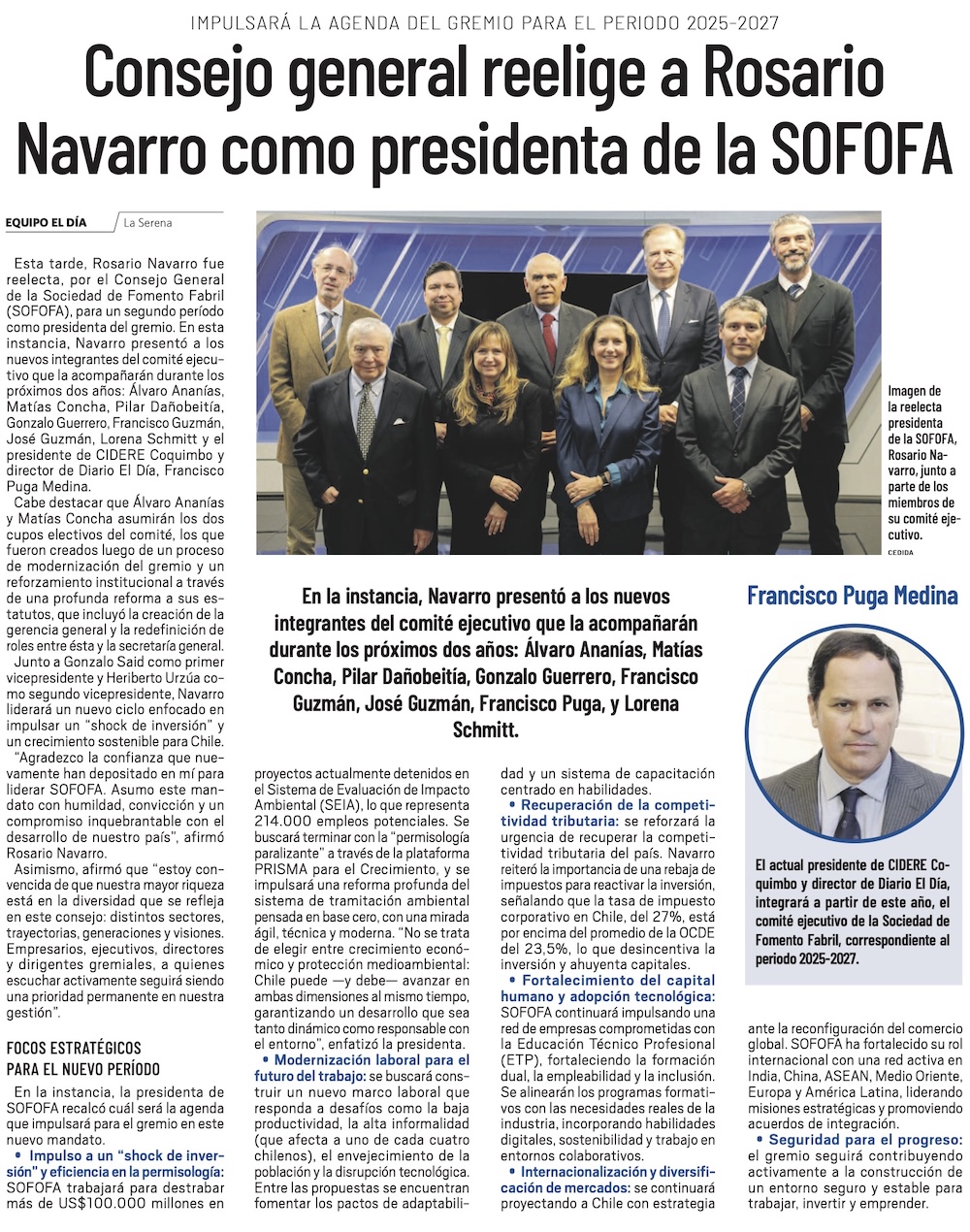 Rosario Navarro es reelegida como presidenta de la Sofofa hasta 2027 - (Pulso)