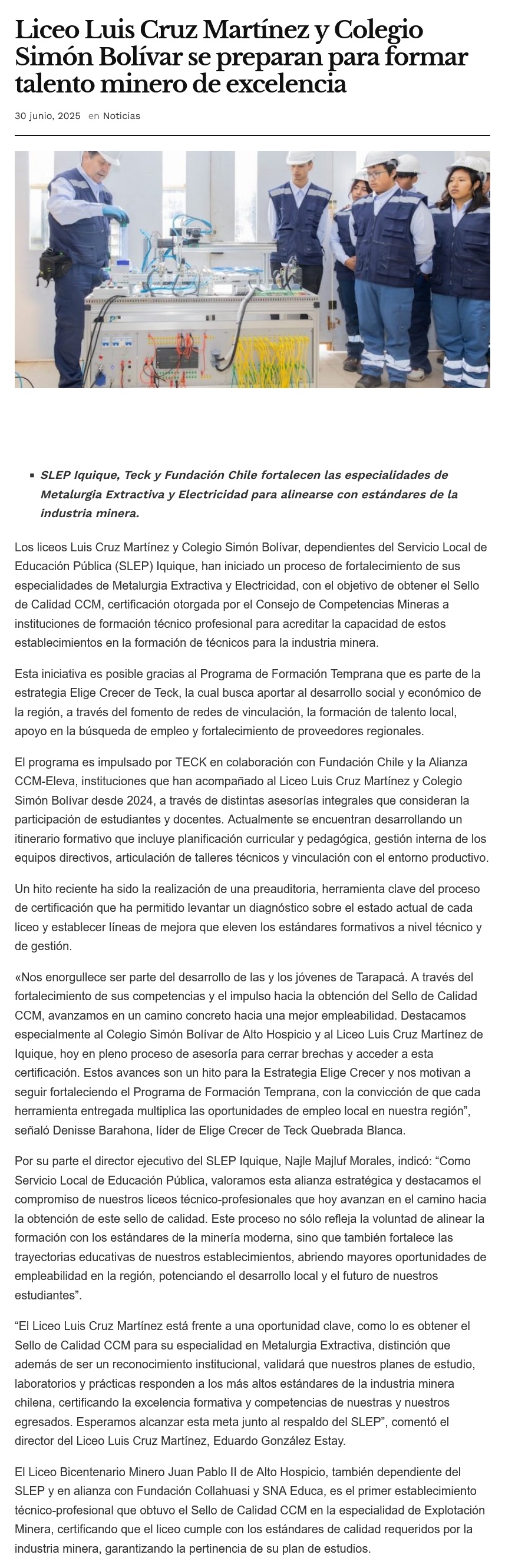 Fortalecen especialidades de Metalurgia Extractiva y Electricidad en Liceo Luis Cruz Martínez de Iquique y Colegio Simón Bolívar de Alto Hospicio - (soyiquique)