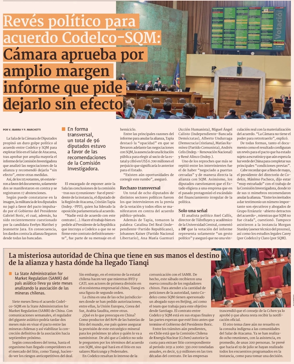 Acuerdo Codelco-SQM: Cámara de Diputados aprueba por amplio margen informe que recomienda dejarlo sin efecto - (DF Online)