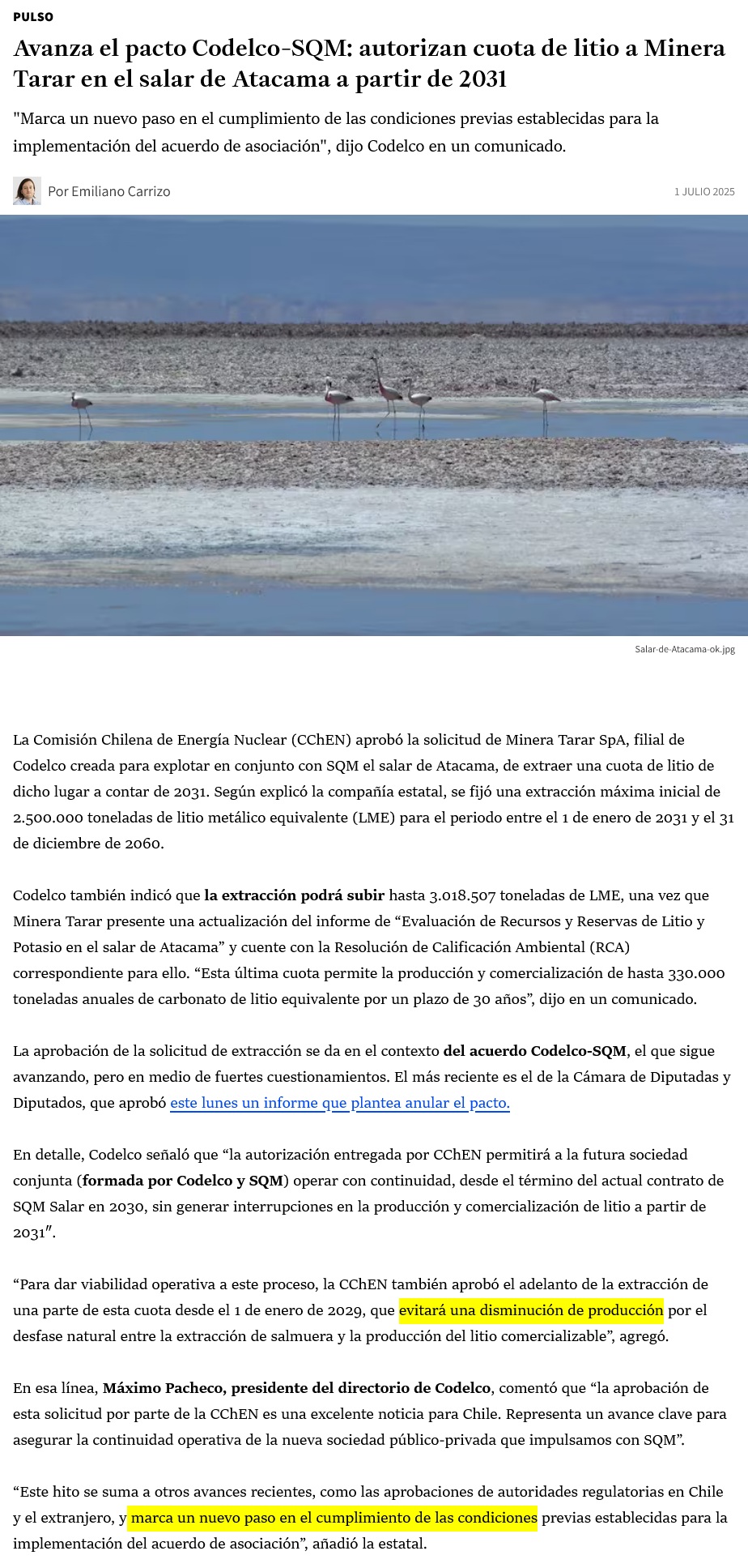 Avanza el acuerdo entre Codelco y SQM: autorizan cuota de litio a Minera Tarar en el salar de Atacama a partir de 2031 - (Pulso)