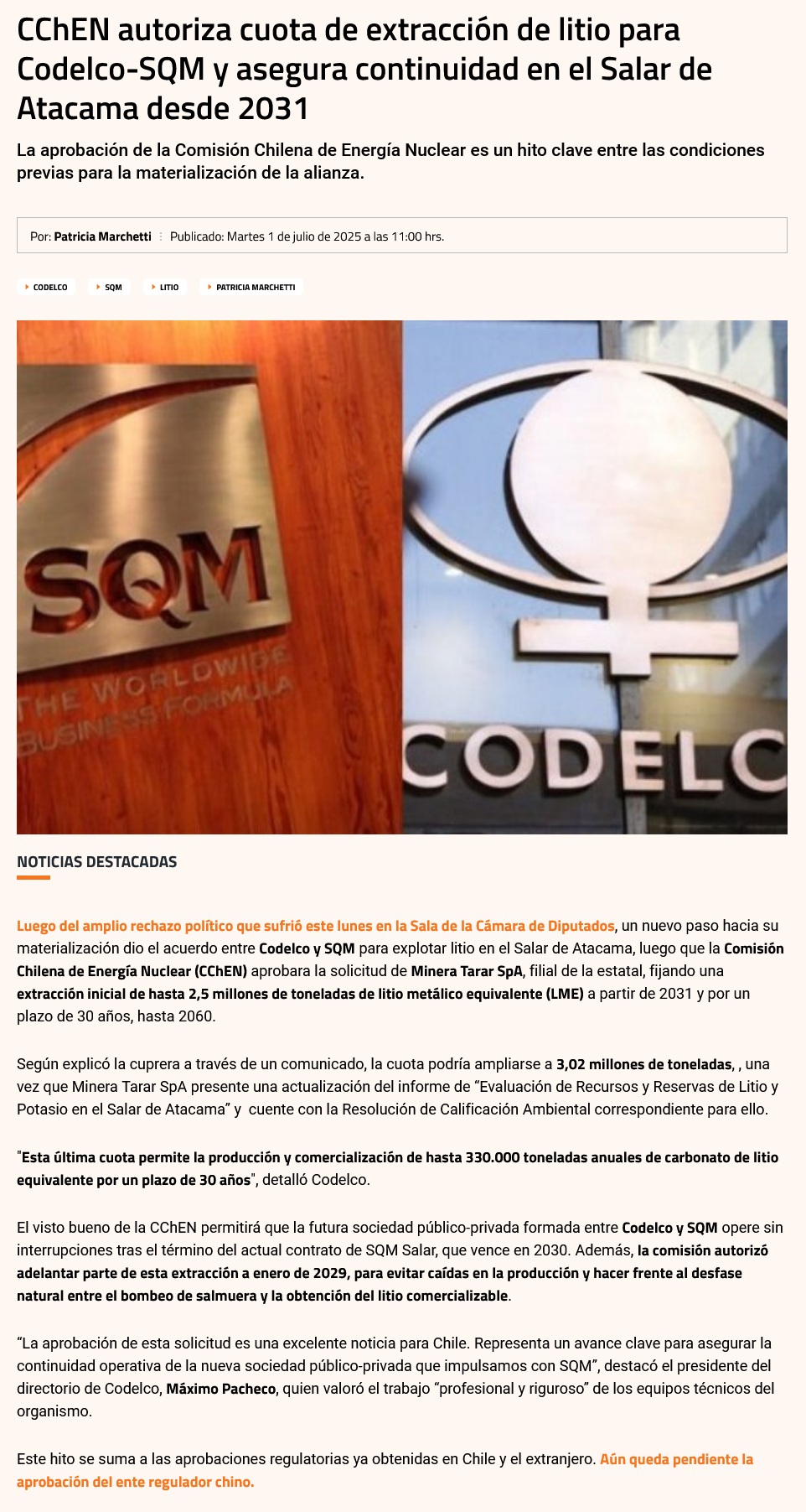 Avanza el pacto Codelco-SQM: autorizan cuota de litio a Minera Tarar en el salar de Atacama a partir de 2031 - (La Tercera Online)