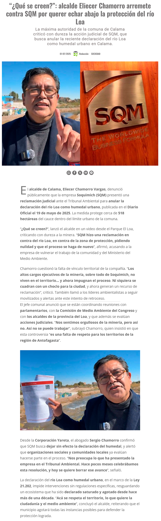 SQM pide al Tribunal Ambiental que MMA anule declaración del río Loa como Humedal Urbano - (El Mercurio de Antofagasta)