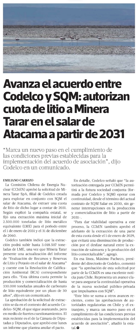 Avanza el pacto Codelco-SQM: autorizan cuota de litio a Minera Tarar en el salar de Atacama a partir de 2031 - (La Tercera Online)