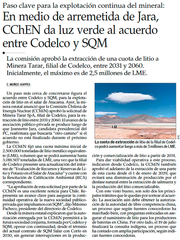Avanza el pacto Codelco-SQM: autorizan cuota de litio a Minera Tarar en el salar de Atacama a partir de 2031 - (La Tercera Online)