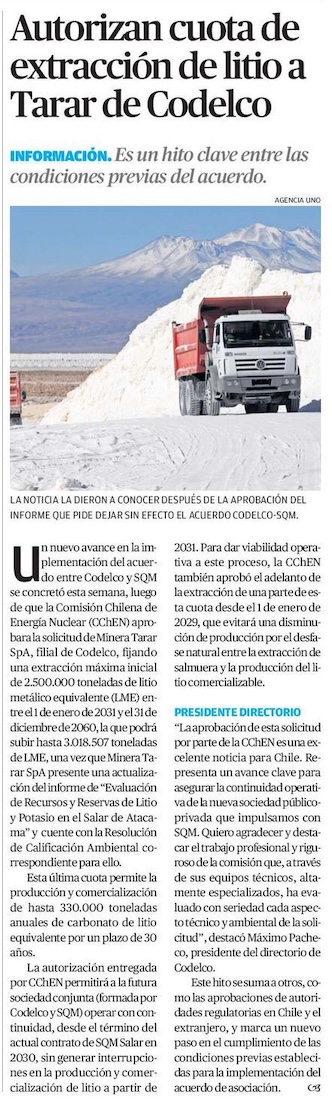 Avanza el pacto Codelco-SQM: autorizan cuota de litio a Minera Tarar en el salar de Atacama a partir de 2031 - (La Tercera Online)