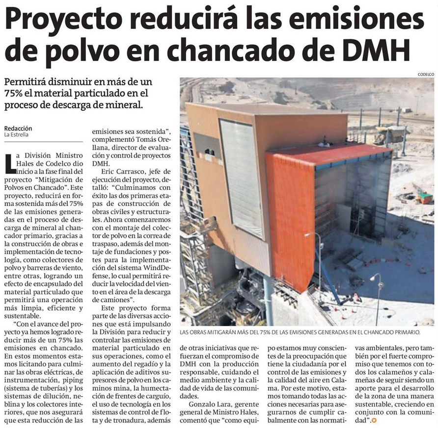 Proyecto que reduce en 75% las emisiones del chancador de DMH entra en fase final - (El Mercurio de Antofagasta)