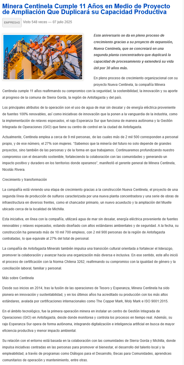 Minera Centinela cumple 11 años avanzando su plan de expansión - (El Mercurio de Antofagasta)