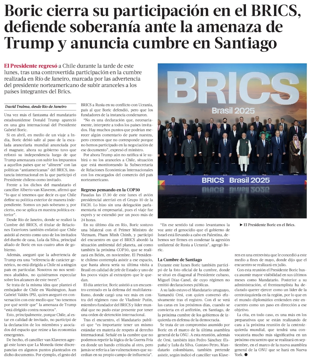 Trump amenaza con nuevo “arancel BRICS”, pero el Gobierno chileno “no se siente aludido” - (El Mercurio de Santiago)