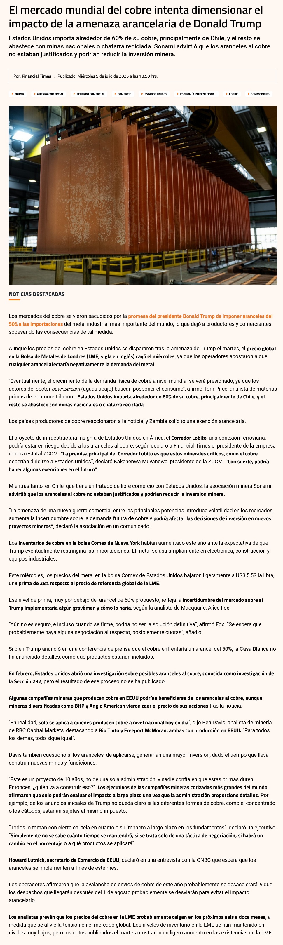 Precio del cobre sufre alta volatilidad tras anuncio tarifario de EE.UU. - (El Mercurio de Santiago)