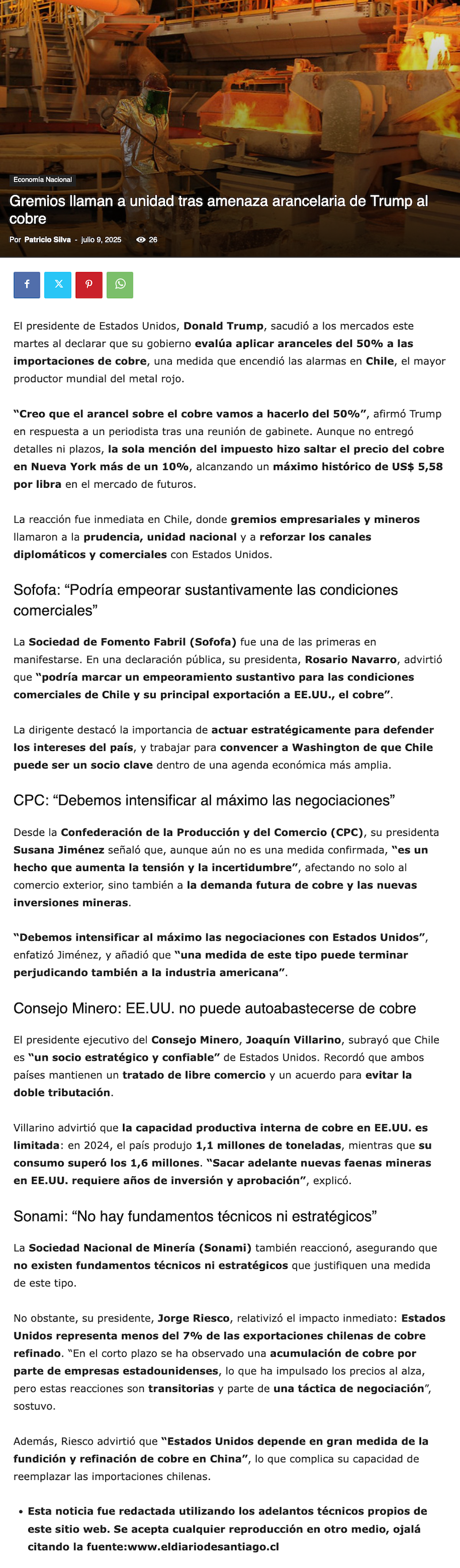 Alerta en Chile tras anuncio de arancel al cobre de Trump: gremios y gobierno llaman a la cautela y defensa estratégica - (mineriayfuturo.cl)