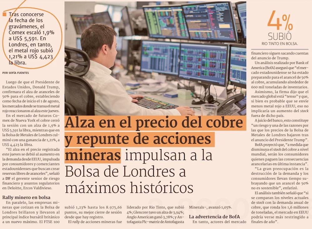 En espera de próximo arancel para el cobre, precio del metal sube más de 1% y acciones mineras saltan - (El Mercurio de Santiago)