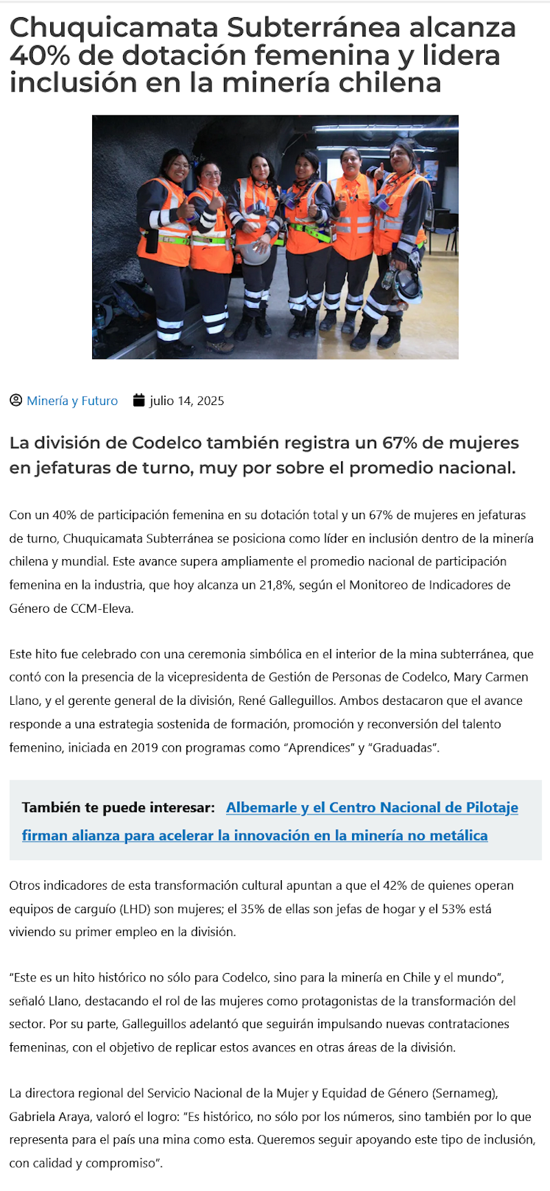 Hito histórico en Codelco: Chuquicamata Subterránea alcanzó 40% de dotación femenina en sus operaciones - (Adprensa.cl)