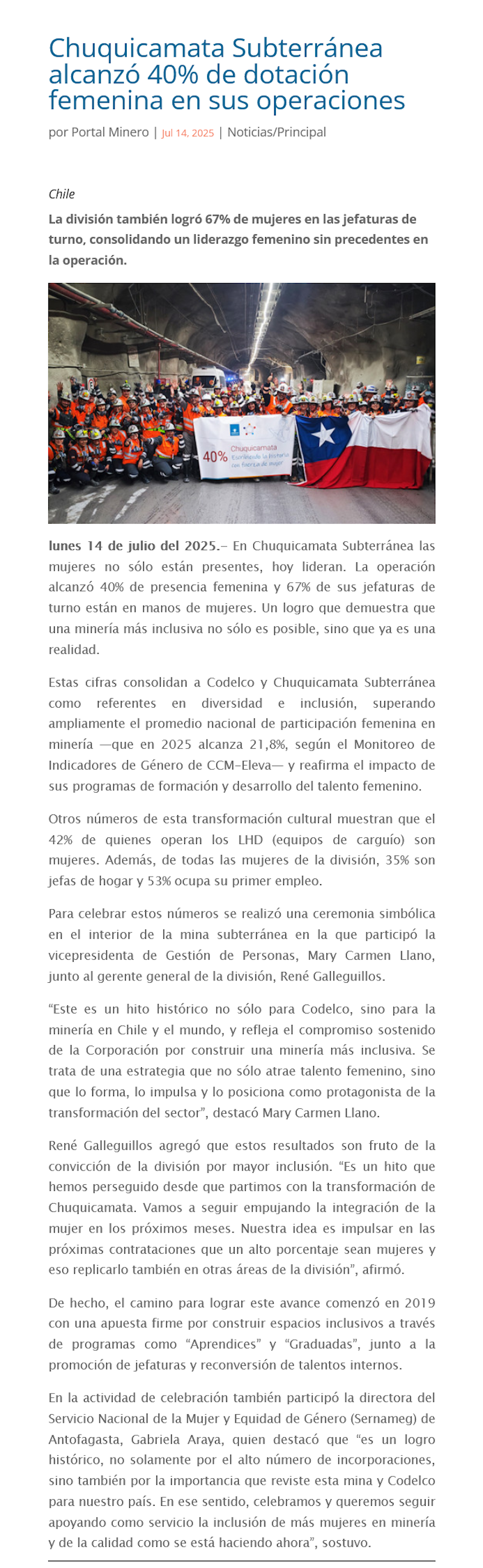 Chuquicamata Subterránea alcanza 40% de dotación femenina y lidera inclusión en la minería chilena - (mineriayfuturo.cl)