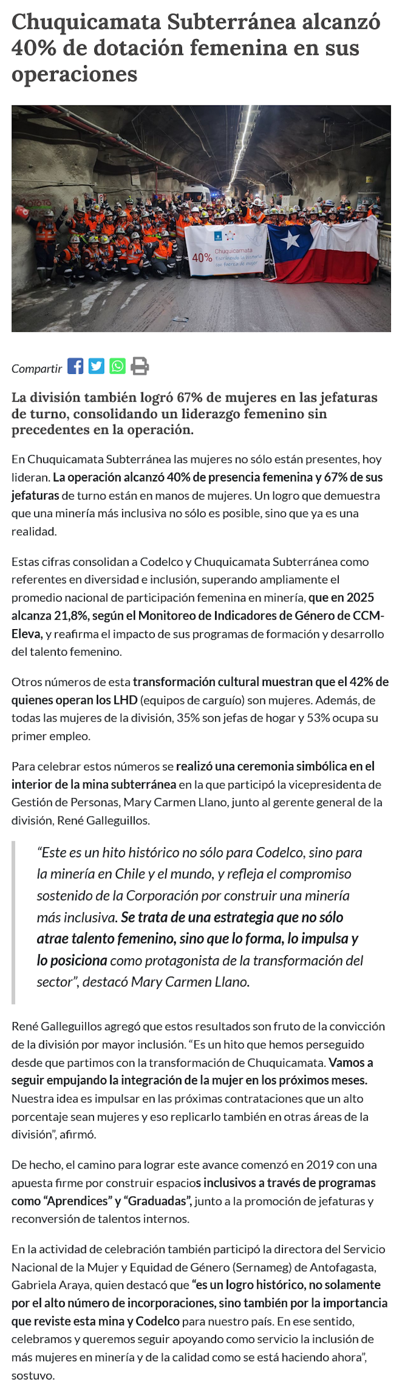 Chuquicamata Subterránea alcanza 40% de dotación femenina y lidera inclusión en la minería chilena - (mineriayfuturo.cl)