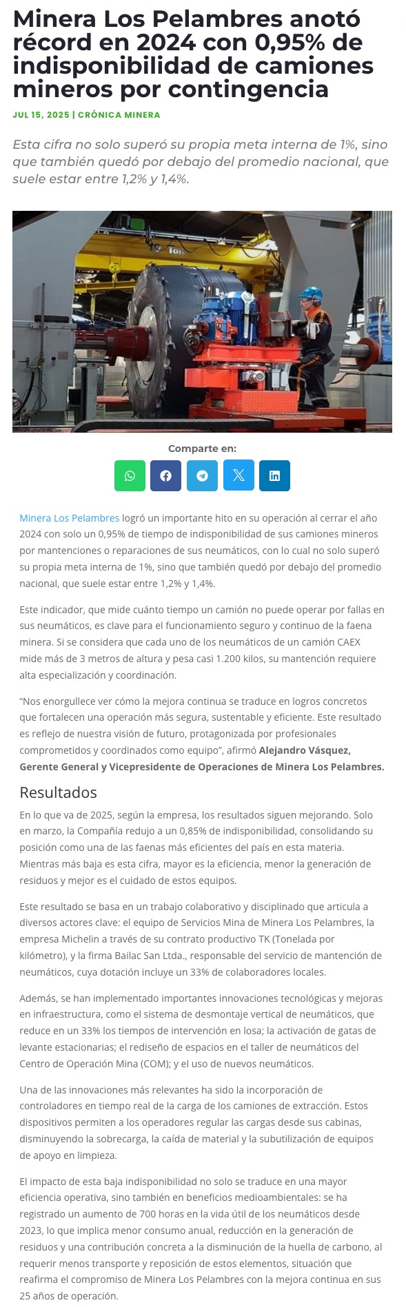 Récord nacional: Minera Los Pelambres lidera en eficiencia y cuidado de neumáticos mineros - (La Región)