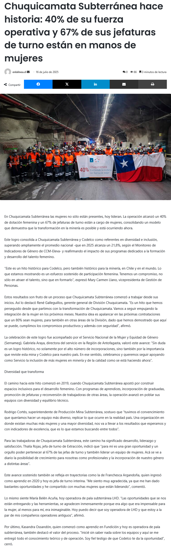Hito histórico en Codelco: Chuquicamata Subterránea alcanzó 40% de dotación femenina en sus operaciones - (mvcomunicaciones.cl)