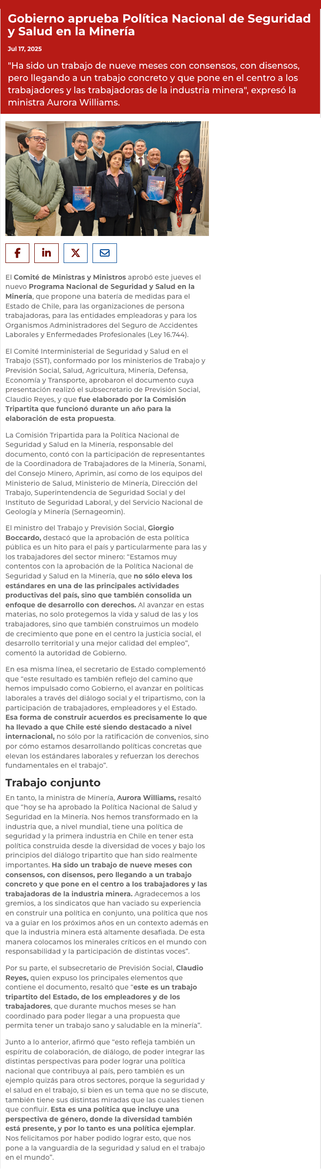 Gobierno aprueba Política Nacional de Seguridad y Salud en la Minería - (mch.cl)